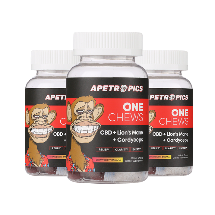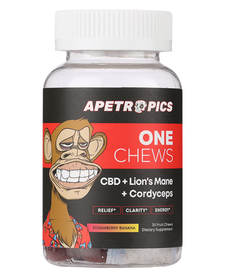 (30) Strawberry Banana Flavored Fruit Chews Per Bottle Potency Per Serving: 25mg of THC-Free Broad Spectrum CBD + 400mg Organic Lion's Mane + Cordyceps Proprietary Adaptogen Blend (Non-Psychoactive)